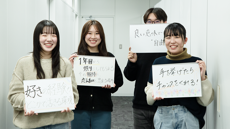 今回は、入社5年目の先輩社員と、昨年新卒入社した若手3名に集まってもらい、就活時代の話から入社後のリアルまで、ざっくばらんに語ってもらいました。